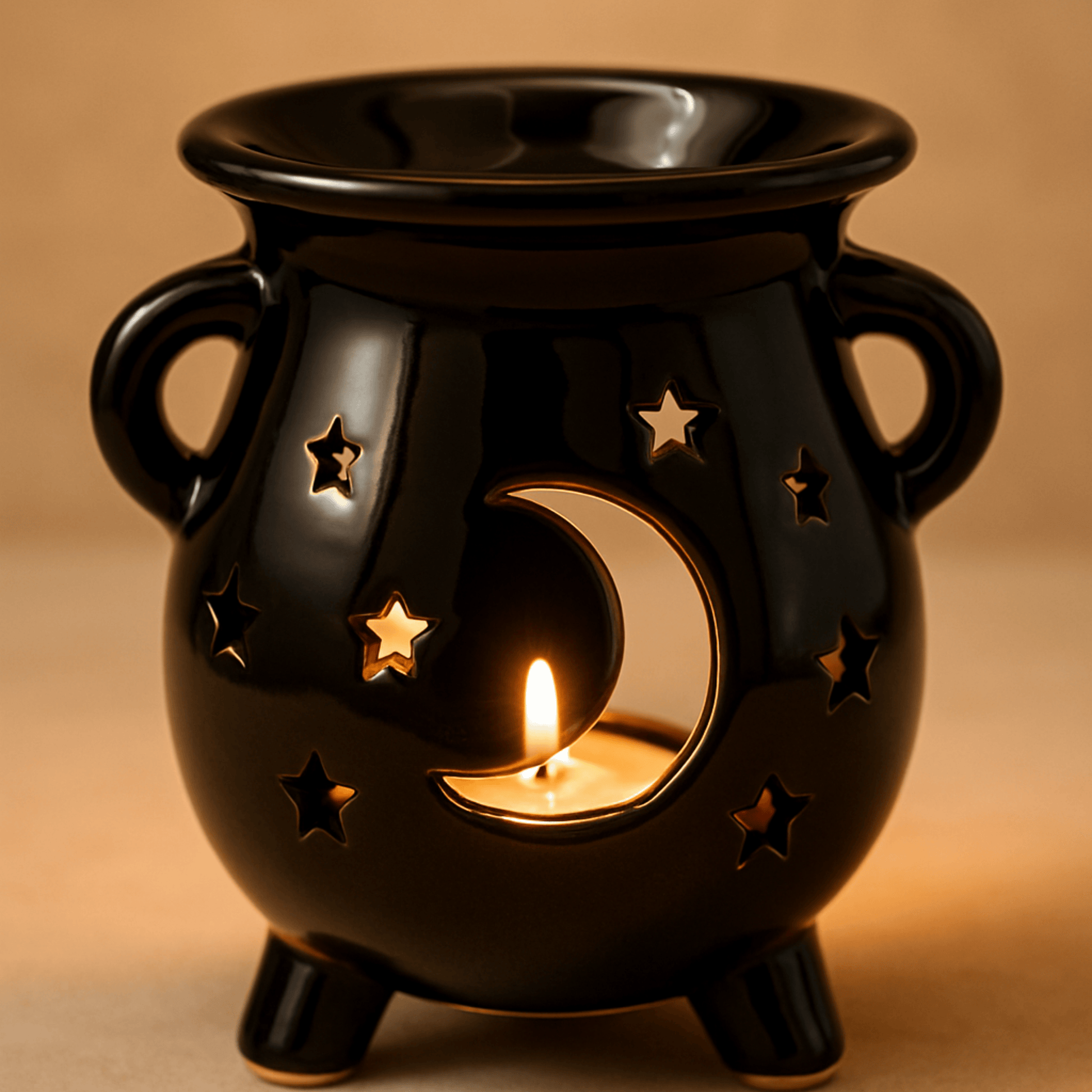 Call in a little moon magic. This glossy black ceramic cauldron glows through crescent-moon and star cut-outs, casting gentle starlight while it warms your favourite fragrance oils, wax melts, or simmering granules. Solid and beautifully finished, it sits perfectly on an altar, bedside, or cosy corner and turns any room into a calm, celestial sanctuary. Sized at 9.5 cm high by 10 × 8 cm, it’s the ideal witchy accent for meditation, spellwork, or simply winding down. Use on a heatproof surface, add water when using oils, and never leave burning unattended. One burner included; tealight not included.