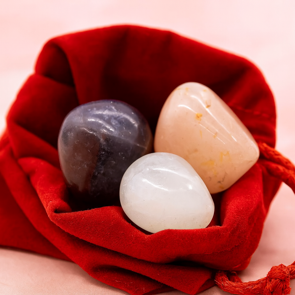 The Golden Triangle Gemstone Set brings together three of the most cherished crystals — Amethyst, Rock Crystal, and Rose Quartz — elegantly presented in a soft red velvet bag. When placed in a triangular formation, this powerful trio is believed to create an energetic grid that purifies, uplifts, and balances the space around you.