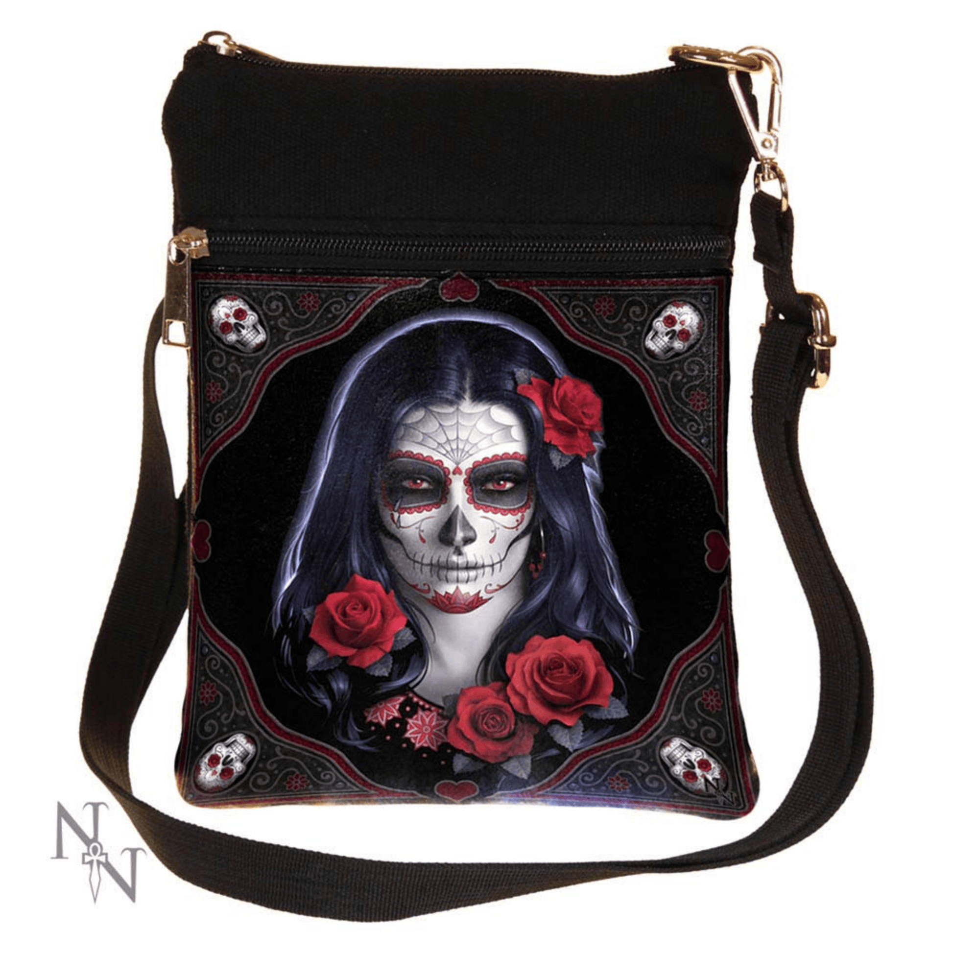 Step into the darker side of fantasy with this striking Sugar Skull shoulder bag, featuring artwork by renowned Gothic and alternative artist James Ryman. Set against a deep black background, a hauntingly beautiful woman gazes outward, her face painted in the style of a red and black Mexican sugar skull, adorned with vivid red roses woven through her dark hair. Delicate skull motifs echo her design at each corner, creating a bold and macabre statement piece.